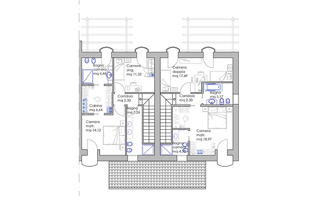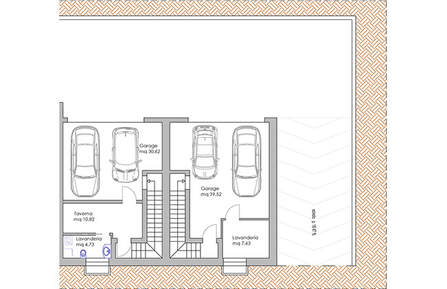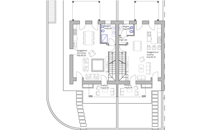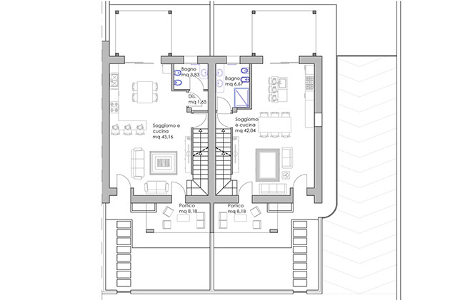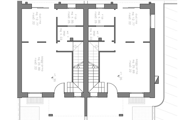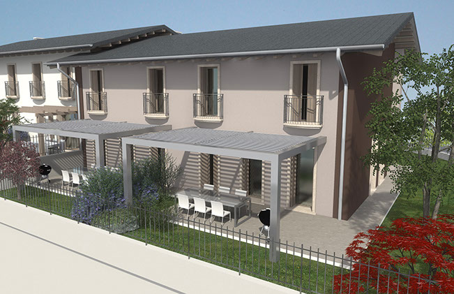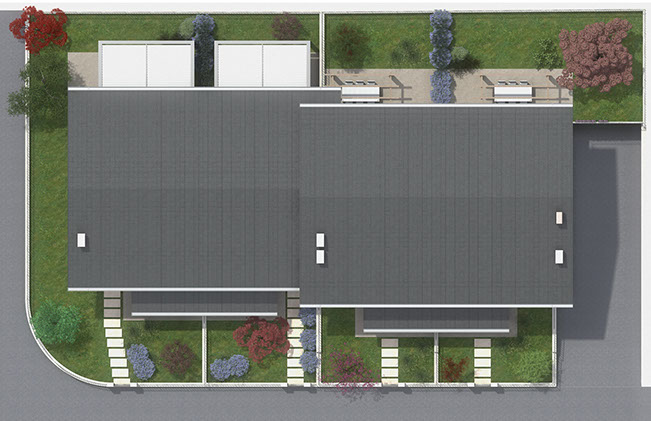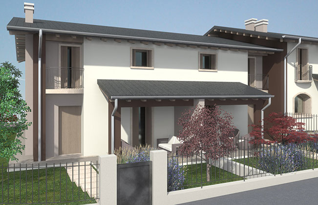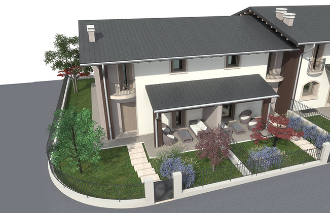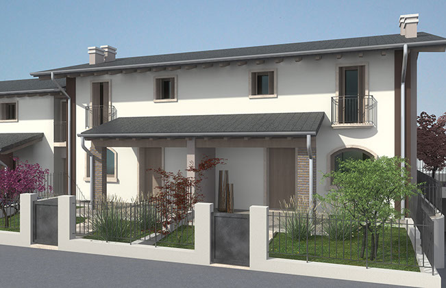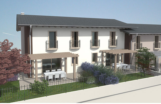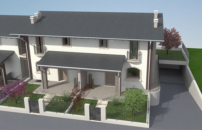 La costruzione sarà composta da quattro unità abitative, ciascuna con una metratura lorda di 70 mq a piano, disposte su due piani fuori terra con giardino di proprietà ed un interrato con rampa ed androne in comune.